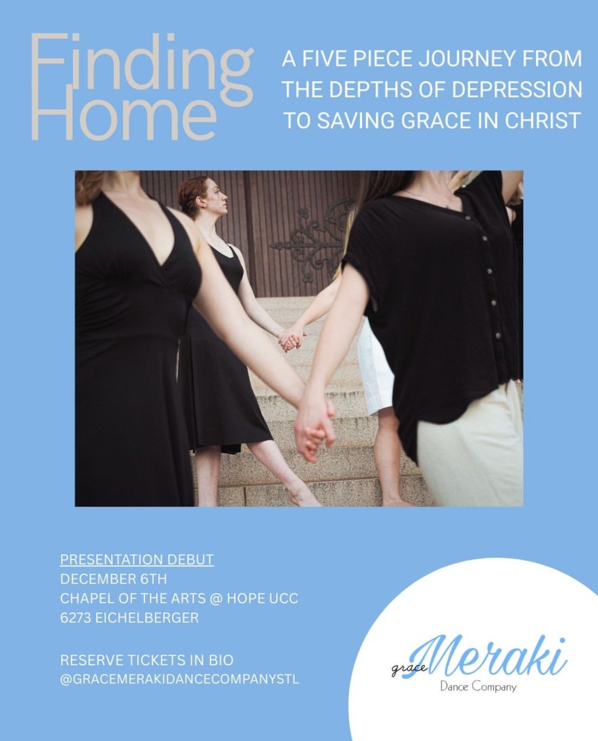 Grace Meraki is a faith centered, contemporary dance company based in St. Louis. Their first live show is a five piece journey from the depths of depression to saving grace in Christ. Please join them Saturday, December 6th for a night of artistry, community, and hope. “Finding Home” will be premiere at the Chapel of the Arts in collaboration with Space Station Dance Residency and Sports Medicine and Training Center.